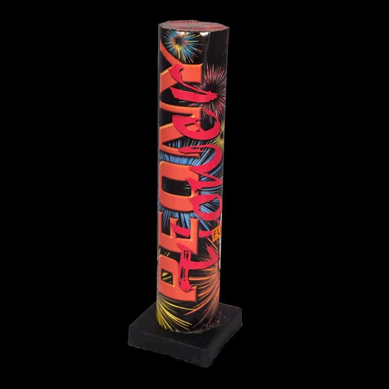 Loaded mortar w/shell that will spread into a red peony flower at 35 meters altitude